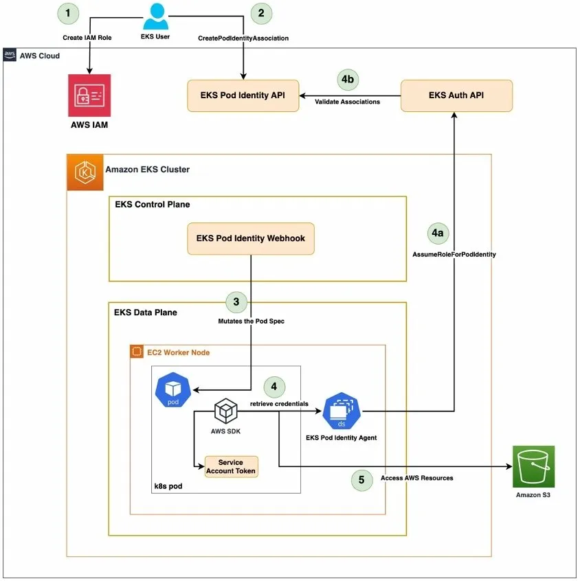 EKS Pod Identity의 전체 인증 흐름은 아래와 같이 5단계로 구성된다.