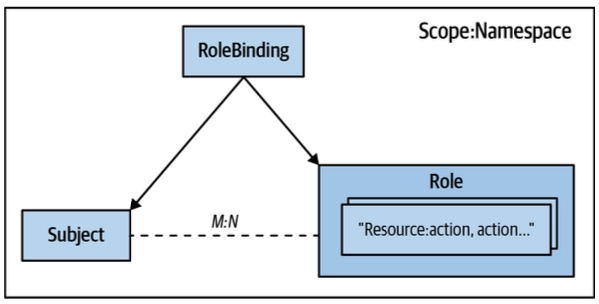 아래 다이어그램은 네임스페이스 범위에서의 RBAC 동작 구조를 보여준다. Subject(사용자 또는 ServiceAccount)가 RoleBinding을 통해 Role에 연결되고, Role에 정의된 리소스와 행위 조합에 따라 API 접근이 허용된다. Subject와 Role 사이는 M:N 관계로, 하나의 Subject가 여러 Role에 바인딩될 수 있고, 하나의 Role이 여러 Subject에게 부여될 수도 있다.