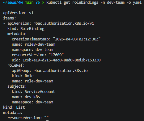 kubectl get sa dev-k8s -n dev-team -o yaml