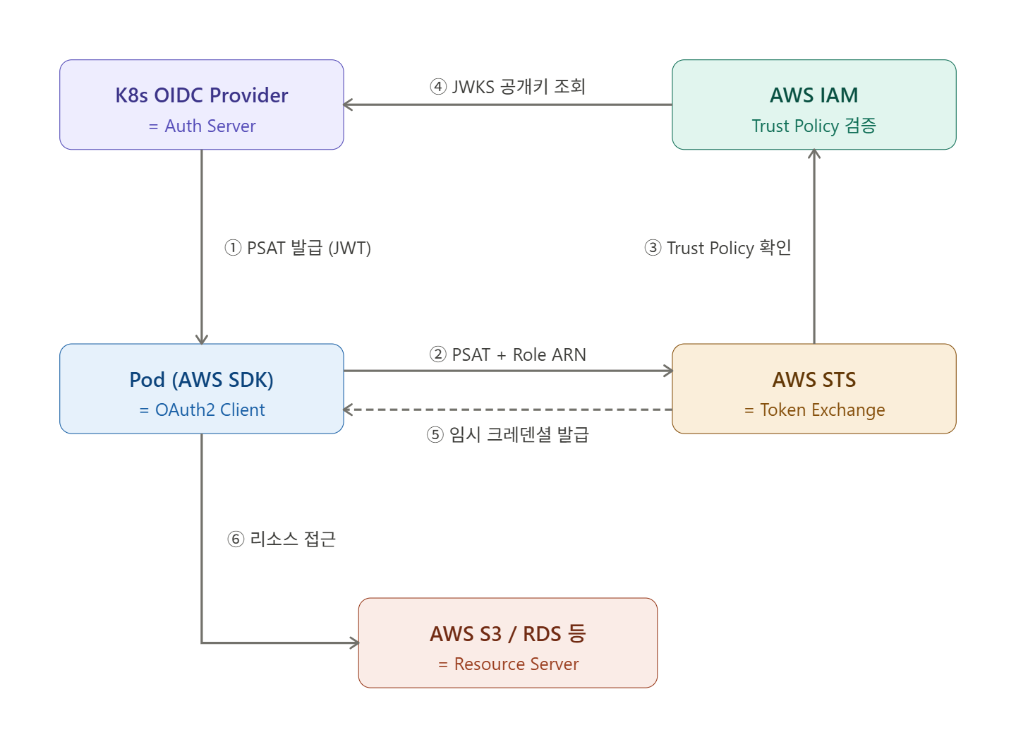 AWS S3 / RDS 등 = Resource Server 임시 크레덴셜을 받은 Client(Pod)가 최종적으로 접근하는 보호된 리소스