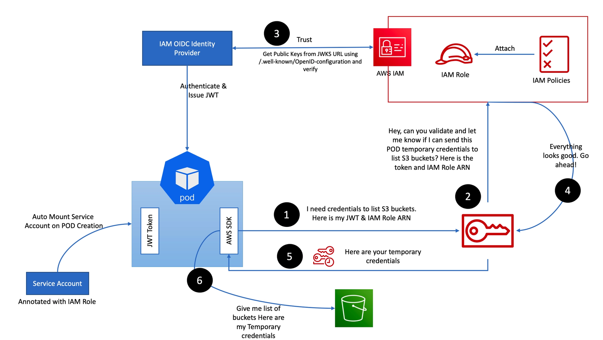다이어그램: "Hey, can you validate and let me know if I can send this POD temporary credentials to list S3 buckets? Here is the token and IAM Role ARN"