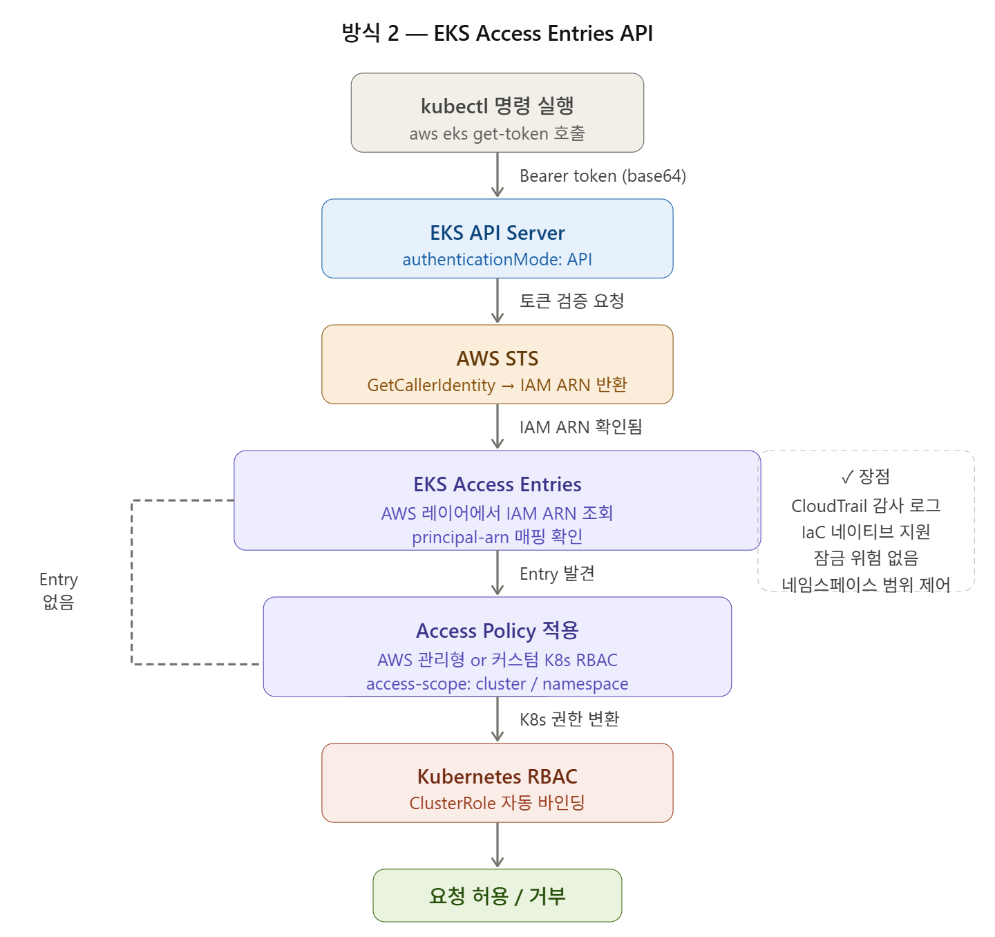 kubectl apply로 Pod 생성 요청이 Kubernetes API 서버에 도달하면, Mutating Admission 단계에서 pod-identity-webhook(iam-for-pods.amazonaws.com)이 호출된다. Webhook은 Service Account의 eks.amazonaws.com/role-arn 어노테이션을 감지하고, 3절에서 설명한 환경 변수, Projected Volume, Volume Mount를 Pod Spec에 자동 주입한다. 이 모든 과정은 사용자가 인지하지 못하는 사이에 투명하게 처리된다.