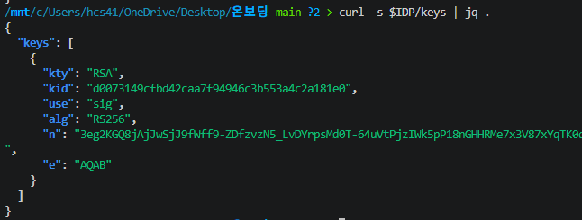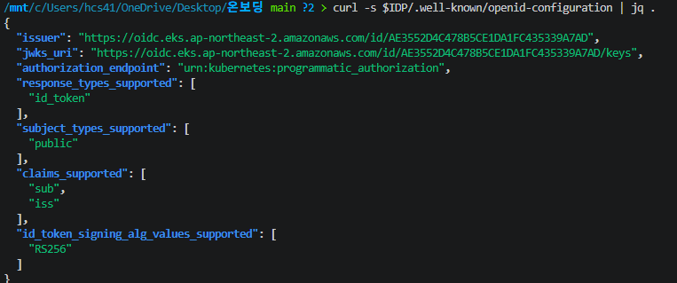 IAM은 2.1절에서 확인한 OIDC Discovery 엔드포인트의 jwks_uri를 호출하여 공개키를 가져온다. 이 키의 kid와 JWT 헤더의 kid를 매칭한 뒤, 해당 RSA 공개키(n, e)로 JWT 서명을 암호학적으로 검증한다.