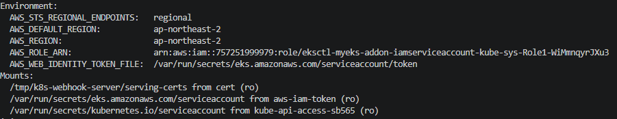 Pod Identity Webhook의 동작을 가장 명확하게 확인하는 방법은, Deployment 원본에 정의되지 않은 env/volume이 실제 Pod에 존재하는지 비교하는 것이다. AWS Load Balancer Controller를 예시로 살펴본다.