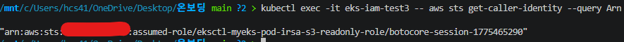 kubectl exec -it eks-iam-test3 -- aws sts get-caller-identity --query Arn