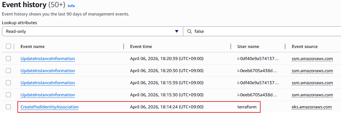 Deployment 원본에는 없던 5개의 환경 변수와 aws-iam-token Volume Mount가 Pod에 존재한다. 이것이 바로 Pod Identity Webhook이 Mutating Admission 단계에서 주입한 결과이다.