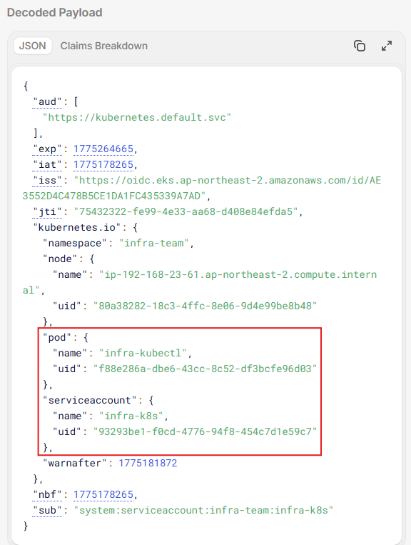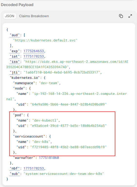kubelet이 만료 전 자동 갱신 (80% 시점)실제 토큰을 디코드 해보면 아래와 같이 페이로드 값들을 확인 가능하다. 각 두 파드에 대해서 이름, 설정한 SA 객체, 생성 시간들은 다르다. 이러한 다른 값들을 아래와 같이 디코드 할 경우 확인 할 수 있다.