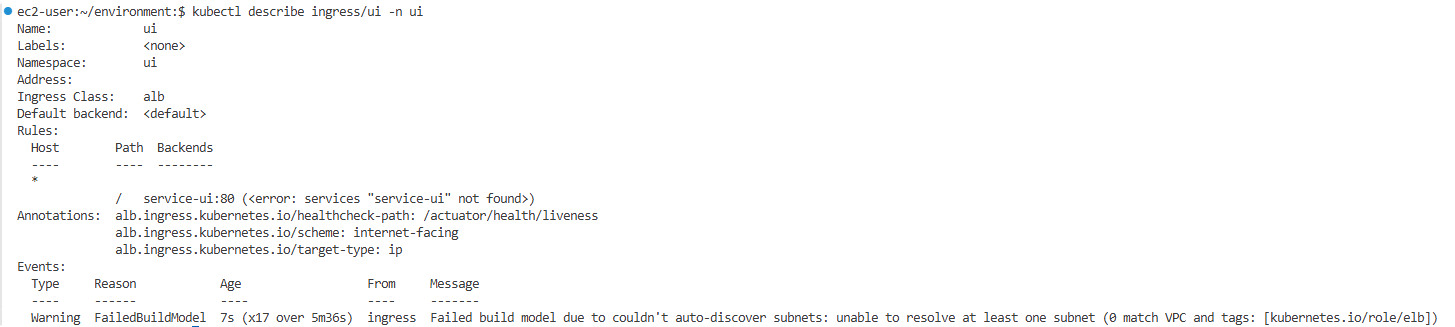 실제 Service 이름은 ui인데, Ingress에서는 service-ui를 참조하고 있다.